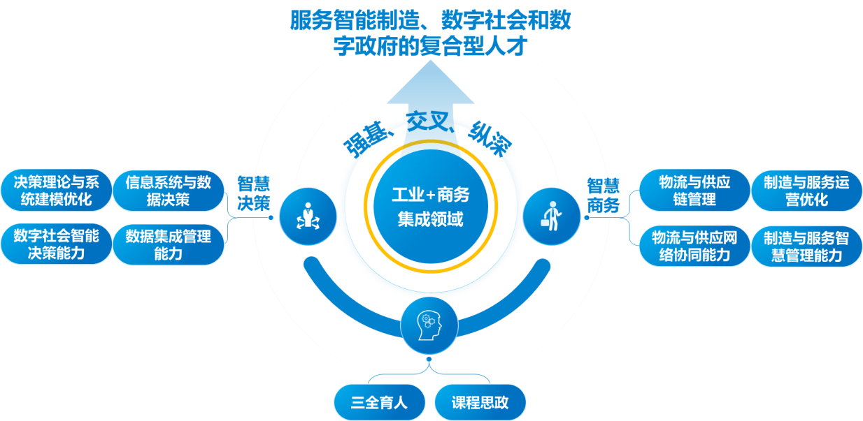 本专业面向大数据赋能需求,培养德、智、体、美、劳全面发展,对工业领域和商务领域的发展动态及新知识、新技术具有一定的敏锐性,系统掌握管理学、经济学、统计学、计算机科学基本理论,具备数据科学与大数据技术基础知识,能够综合运用大数据管理理论、方法和工具,对现代管理业务问题进行数据建模、智能分析和管理决策,在智能制造、数字社会(如互联网、金融、电信等)、数字政府等领域从事大数据管理系统规划设计、运行维护、分析优化和智能决策支持等工作的高素质、复合型管理人才。