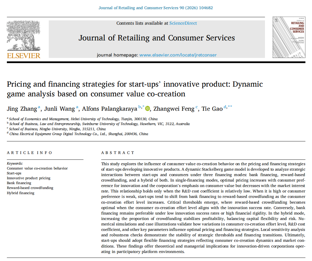 河北工业大学经济管理学院张敬教授聚焦于初创企业创新产品的定价与融资策略研究,在《Journal of Retailing and Consumer Services》发表了一篇题为“Pricing and financing strategies for start-ups’ innovative product: Dynamic game analysis based on consumer value co-creation”的文章。该期刊为SSCI收录期刊,中国科学院1区TOP,ABS 2级,学院A2级期刊,影响因子13.1。